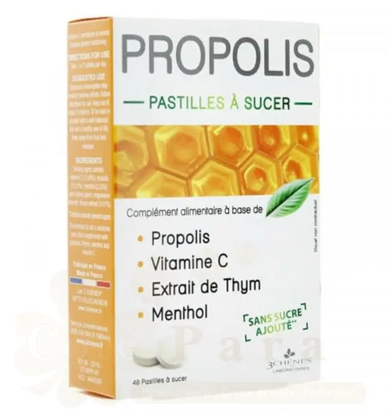 Les 3 Chênes Propolis Défenses Naturelles 40 Pastilles à Sucer sont enrichie en menthol, thym, vitamine C* mais sans sucres ajoutés.