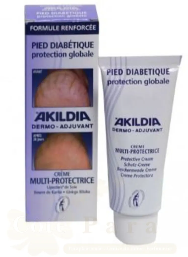 AKILDIA Crème Pieds Multi-Protectrice : Assure une protection globale du pied fragilisé Protège et régénère la barrière d’hydratation de la peau Lutte contre les inconforts occasionnés par la sécheresse Procure une hydratation profonde et durable La peau est soyeuse et plus souple Formule douce convenant aux pieds diabétiques