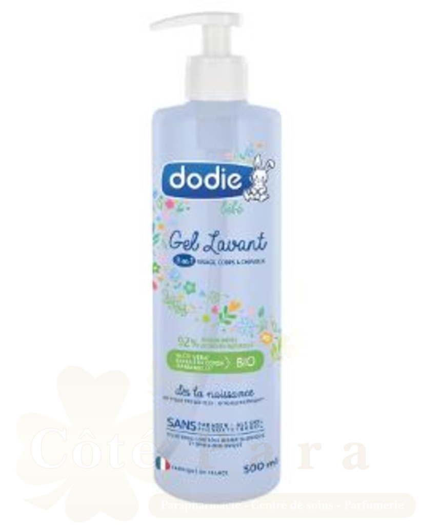 Le gel lavant Dodie adoucit et apaise l’épiderme et le cuir chevelu fragiles de bébé, tout en lui apportant confort et hydratation