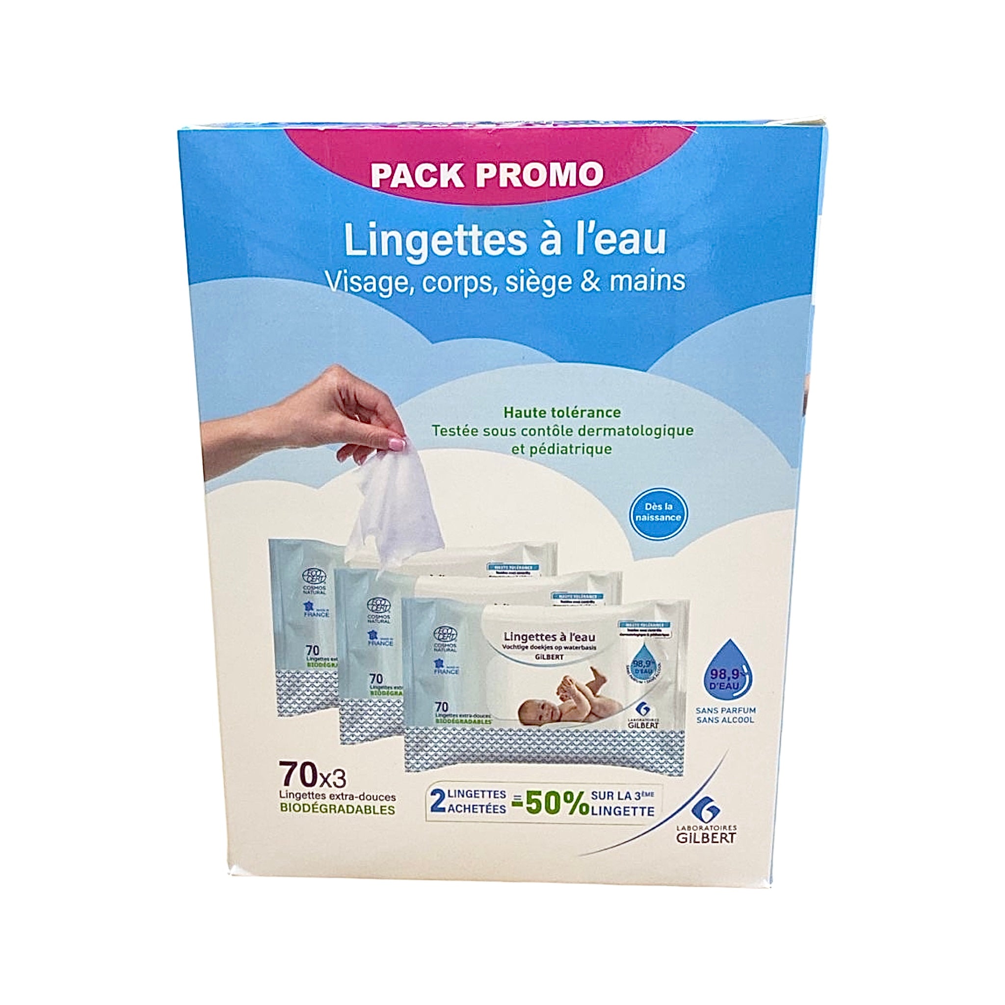 Description : GILBERT LINGETTES À L’EAU PACK PROMO 3*70U BIODEGRADABLES (-50% SUR LA 3 EME LINGETTE)